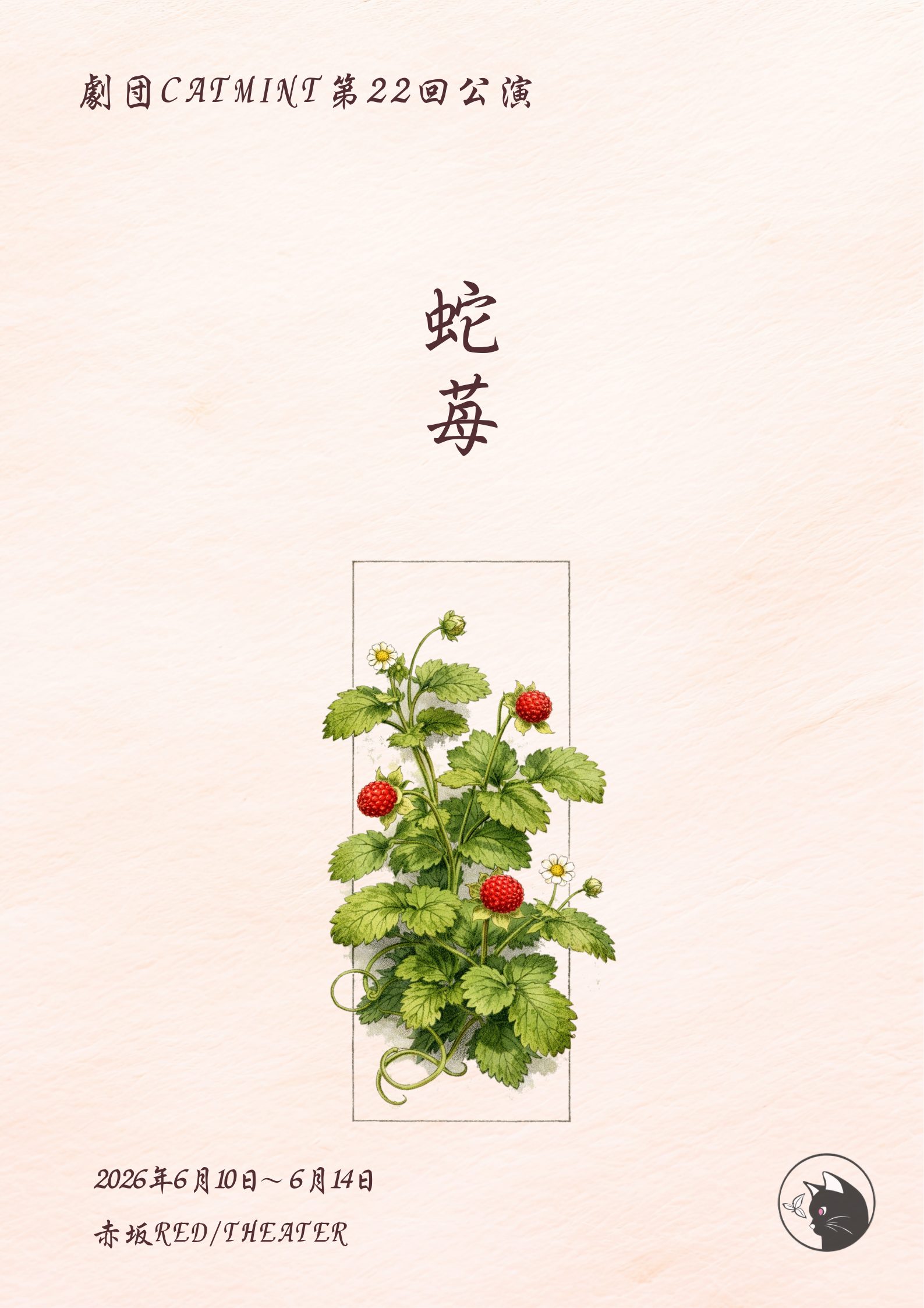 2026年6月10日〜14日劇団CATMINT第22回公演「蛇苺」に出演いたします。